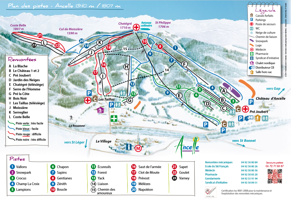 20 pistes : 5 vertes, 7 bleues, 7 rouges, 1 noire soit 30 km de ski alpin. 2 télésièges et 11 téléskis Stade de slalom Snowpark Jardin des neiges